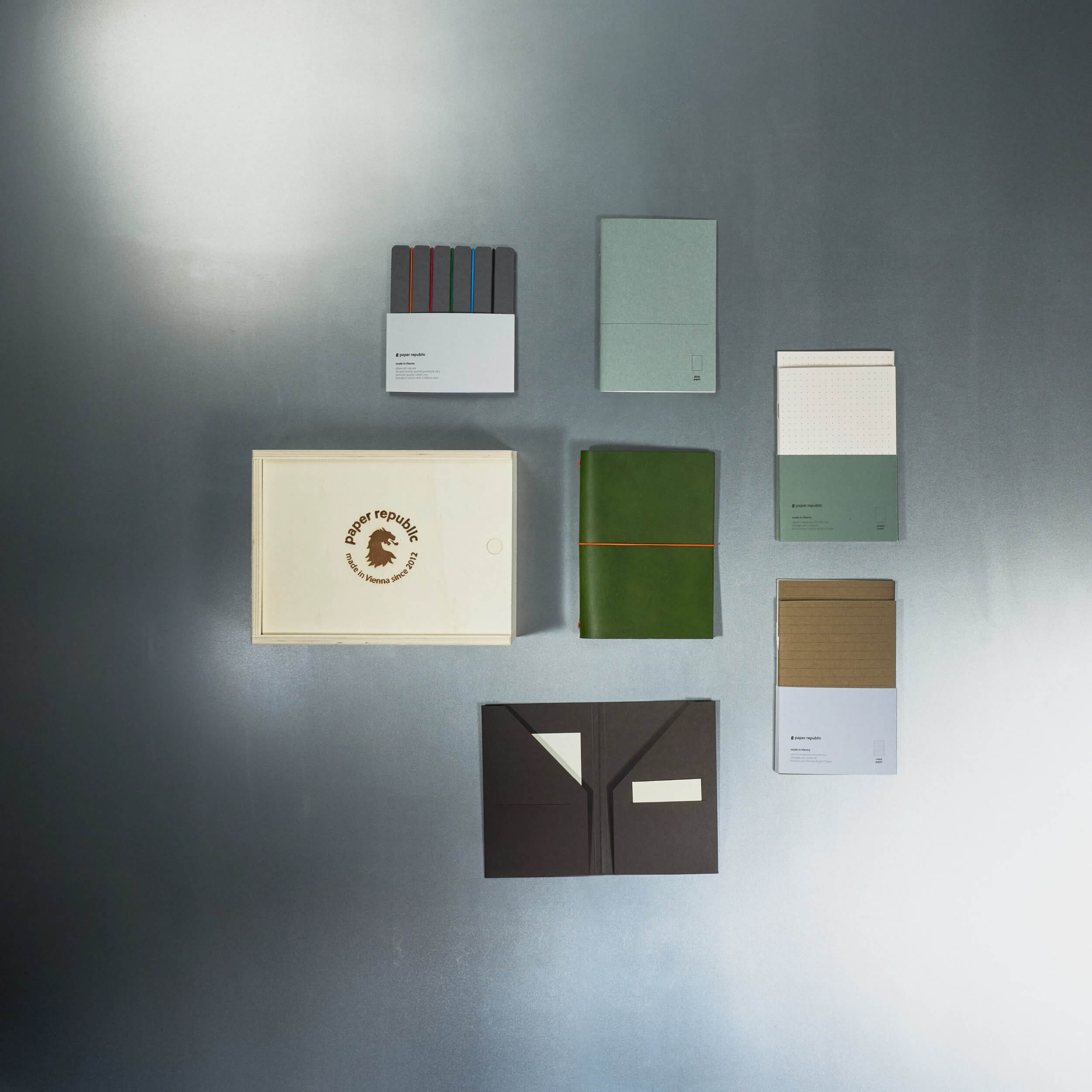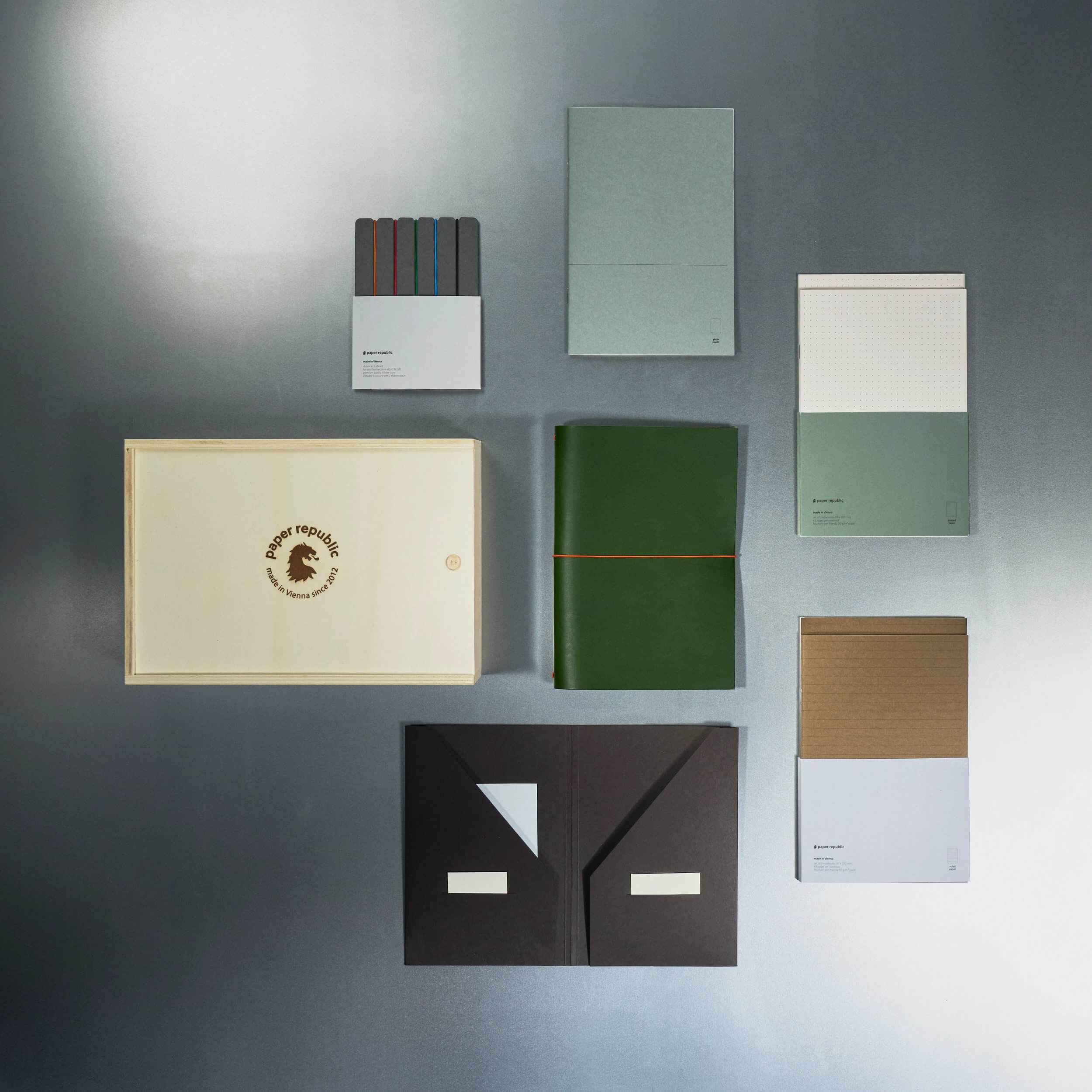 The essential kit includes a grand voyageur (comes with one plain notebook), four refill notebooks, a card & cash holder and a ribbon kit, which we pack with care in a beautiful wooden box from Austria.