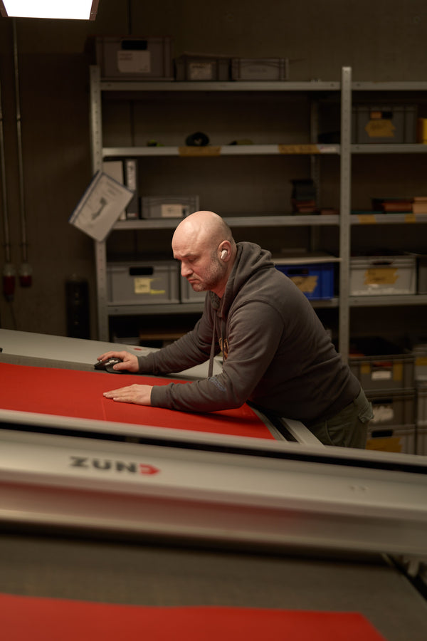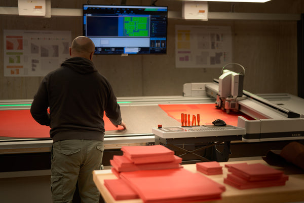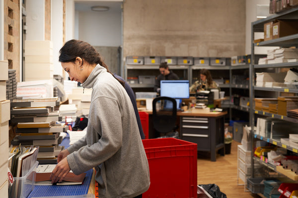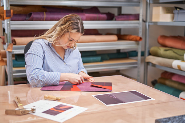 Welcome to [the bank], the home of our stock team. This is where every grand voyageur gets its ribbon, carefully tied by hand, and where the leather for all of our products is cut using our trusted cutting machine.
