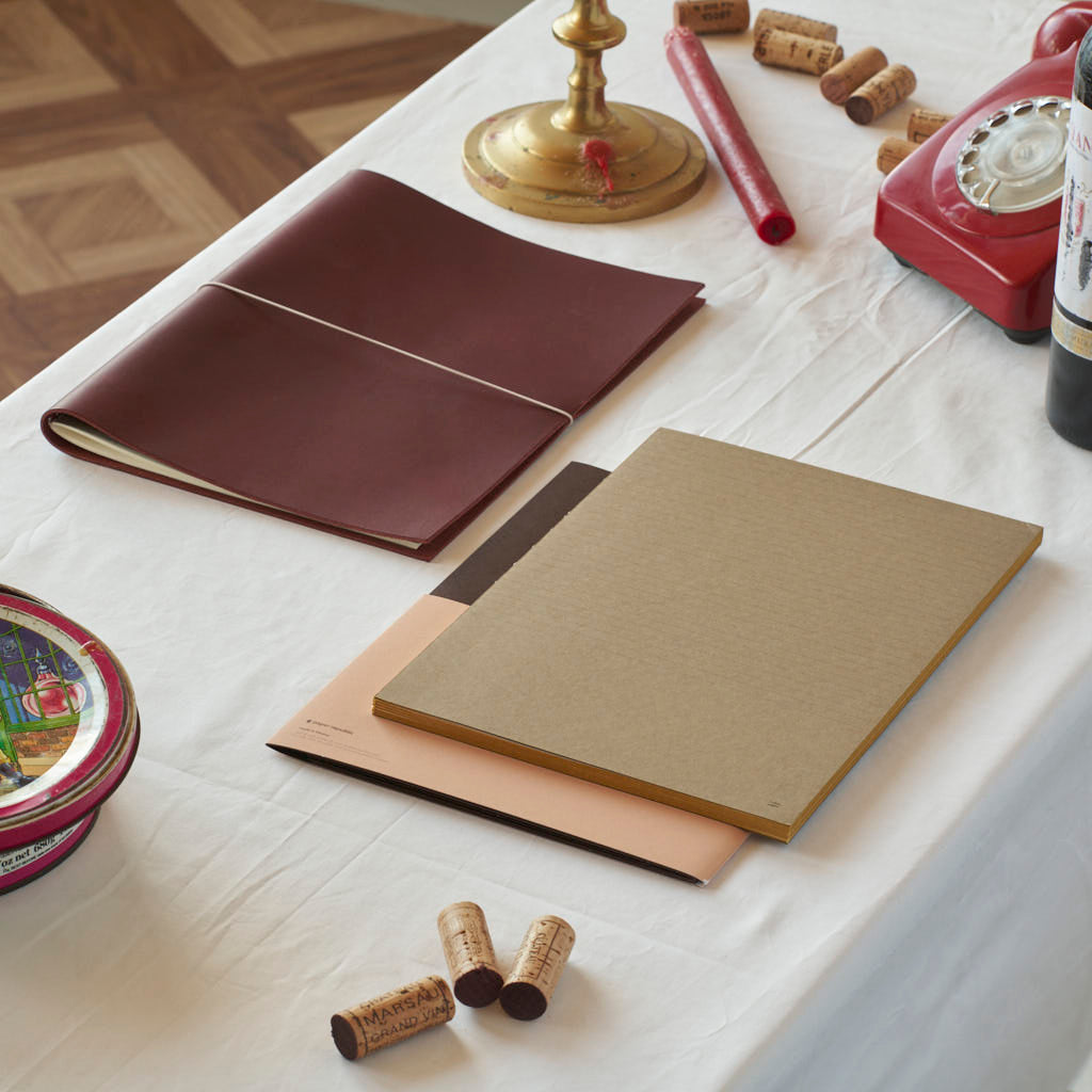the pages are edge finished by hand, the thread is coloured, and we’ve left the 240 g/m² fine-grain front-cover plain, so you can personalise it as you like